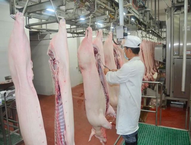 毛豬車輛入廠時嚴格車輪消毒池和人員專用通道消毒;卸車后經(jīng)過清洗、消毒、烘干等環(huán)節(jié)徹底消殺后方可出廠,確保安全;